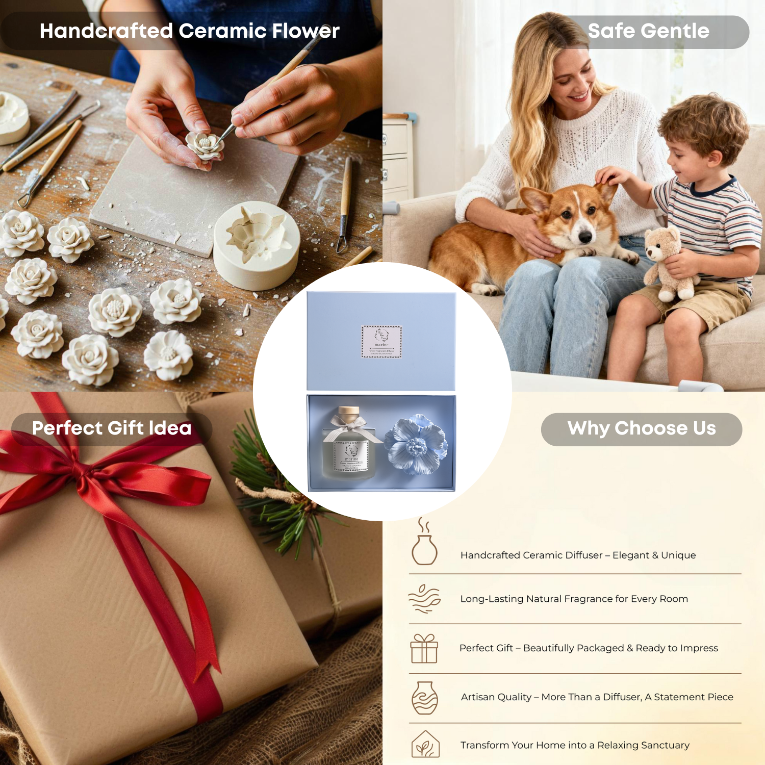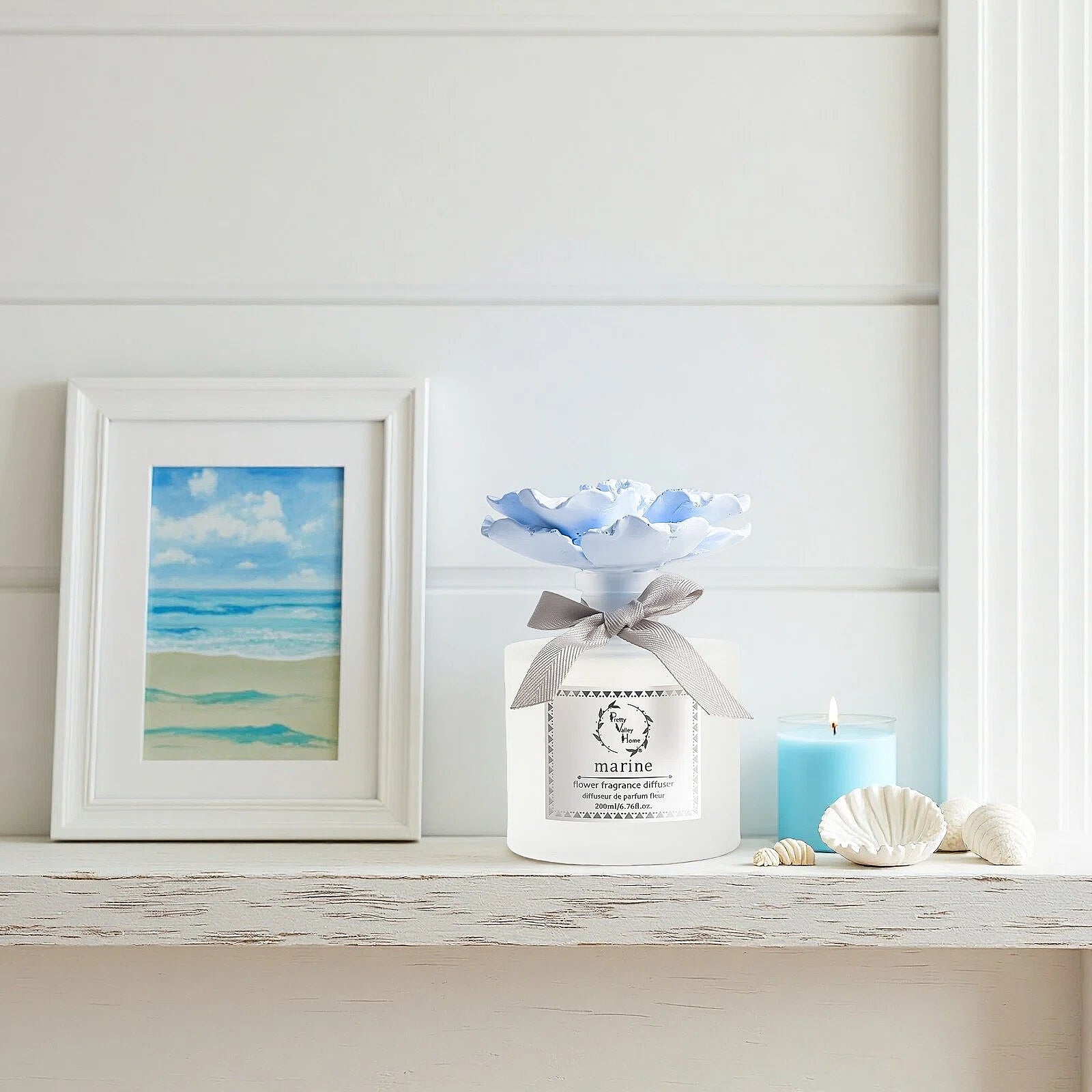 Inspired by the serenity of the sea, this elegant diffuser features a handcrafted blue ceramic flower, designed to slowly release a clean, oceanic fragrance that brings calm and clarity to your home.