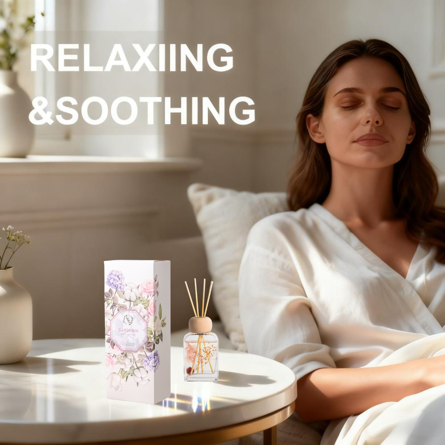 Infuse your living space with the luxurious scent of Gardenia. This 3.4 fl oz reed diffuser set delivers a soft, floral fragrance that refreshes bedrooms, bathrooms, living rooms, and office areas, creating a soothing and welcoming environment.
