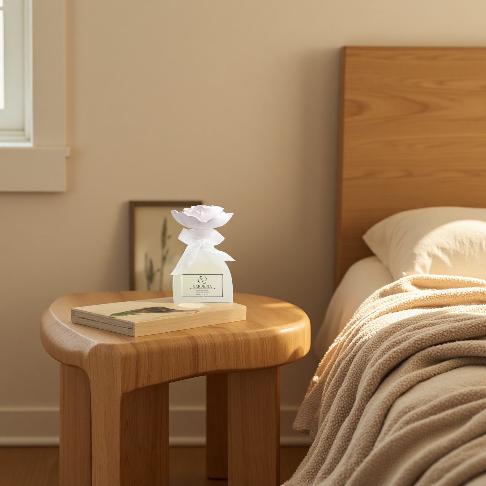 Each diffuser features a delicate handmade ceramic flower that absorbs and slowly releases the enchanting scent of Gardenia and Rose.