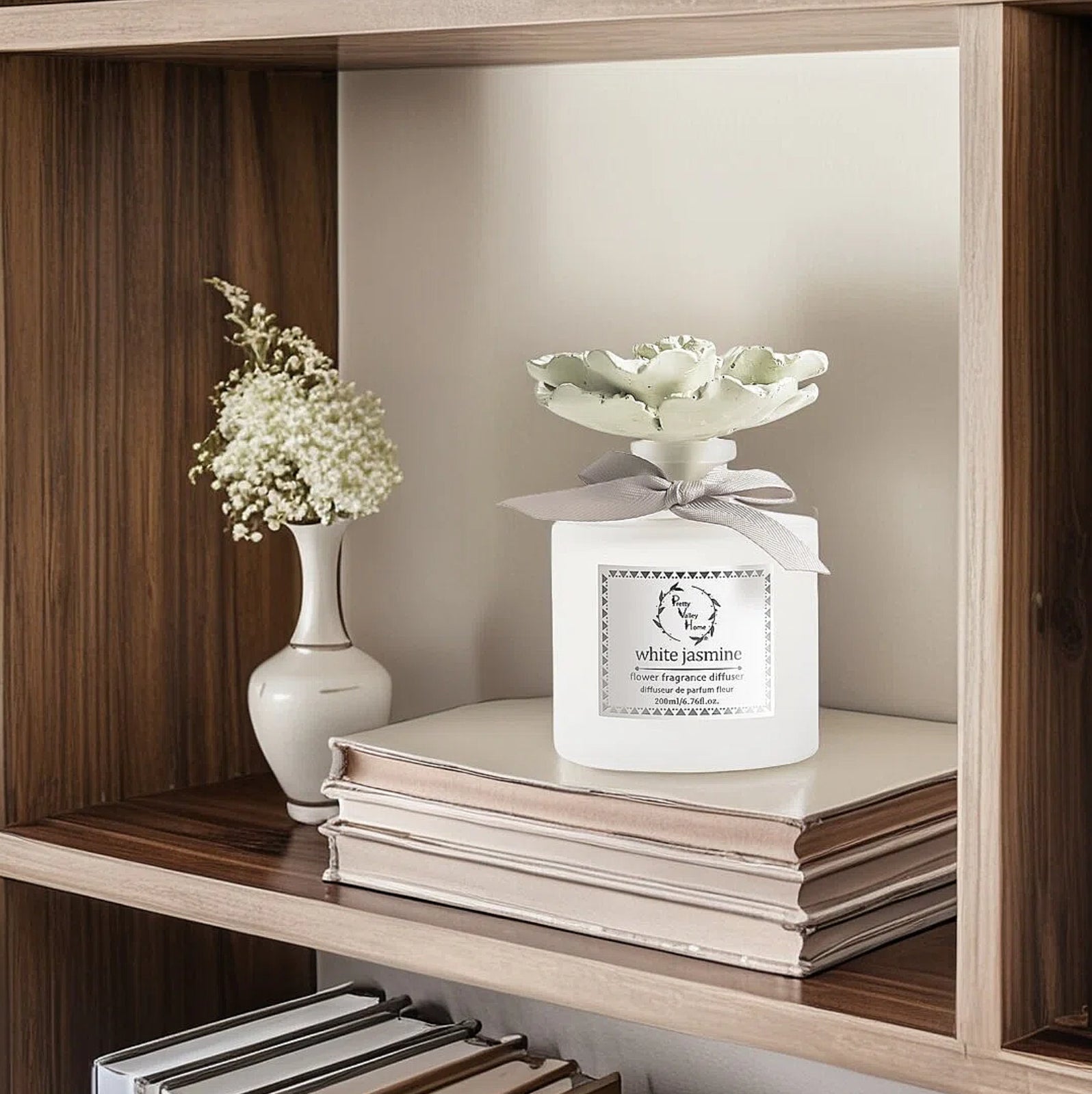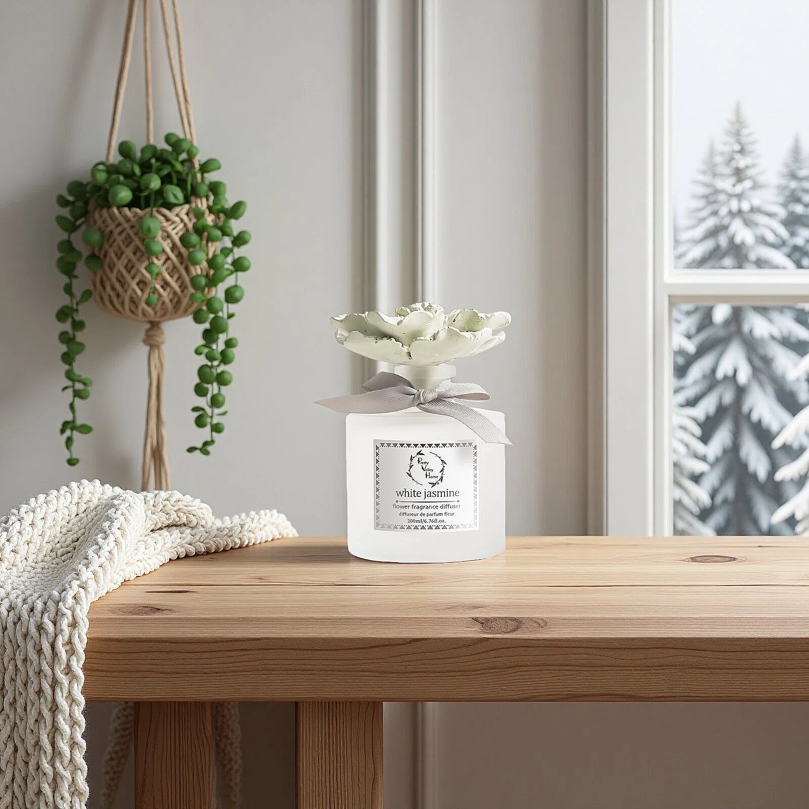 This beautifully designed diffuser combines handcrafted artistry with natural fragrance, featuring a delicate light green ceramic flower that absorbs and slowly releases the refreshing aroma of blooming white jasmine.