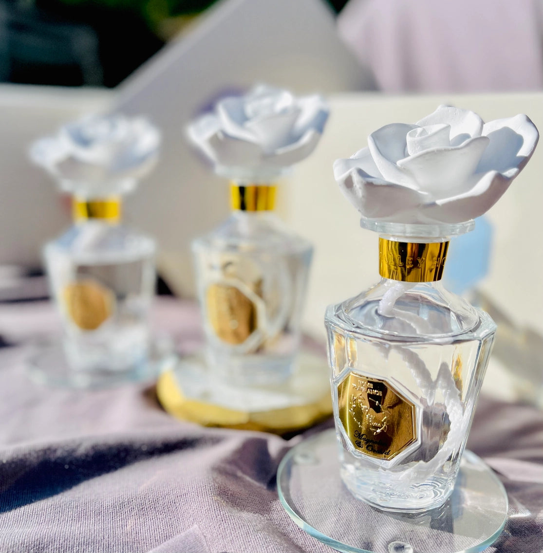 - This exquisite diffuser draws inspiration from the elegance of vintage perfume bottles, bringing timeless beauty into your space. Its design features intricate crystal details that catch the light, adding a touch of sparkle and sophistication. Atop the diffuser sits a beautifully crafted ceramic rose, which not only serves as a stunning decorative element but also gently diffuses a lovely floral scent into the air. Perfect for elevating any room, this diffuser combines artful design with an inviting fragrance, creating a serene and romantic atmosphere.